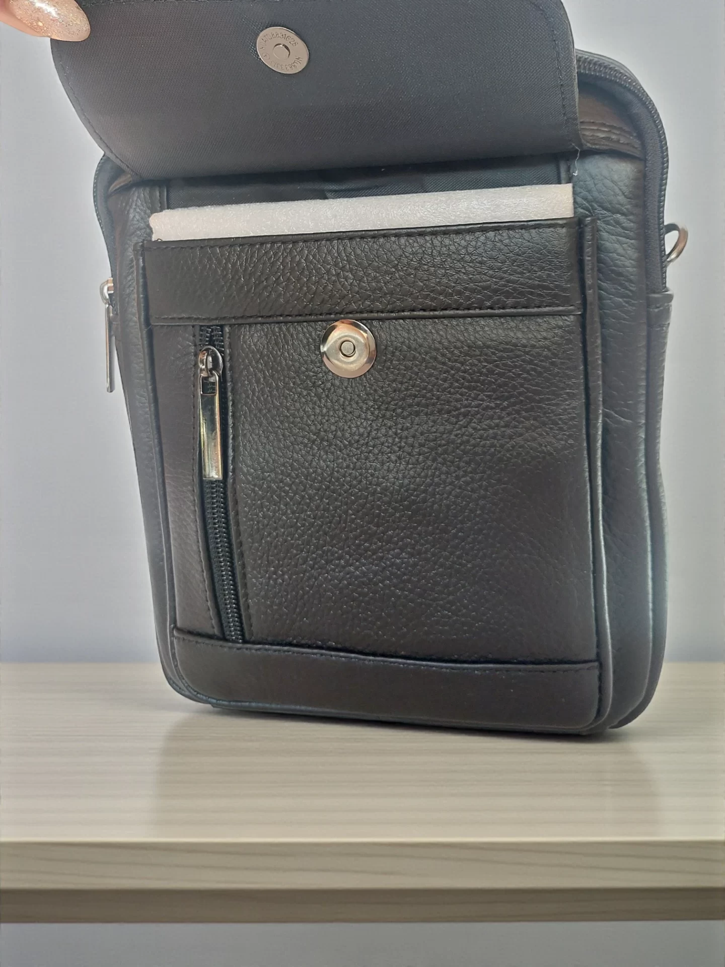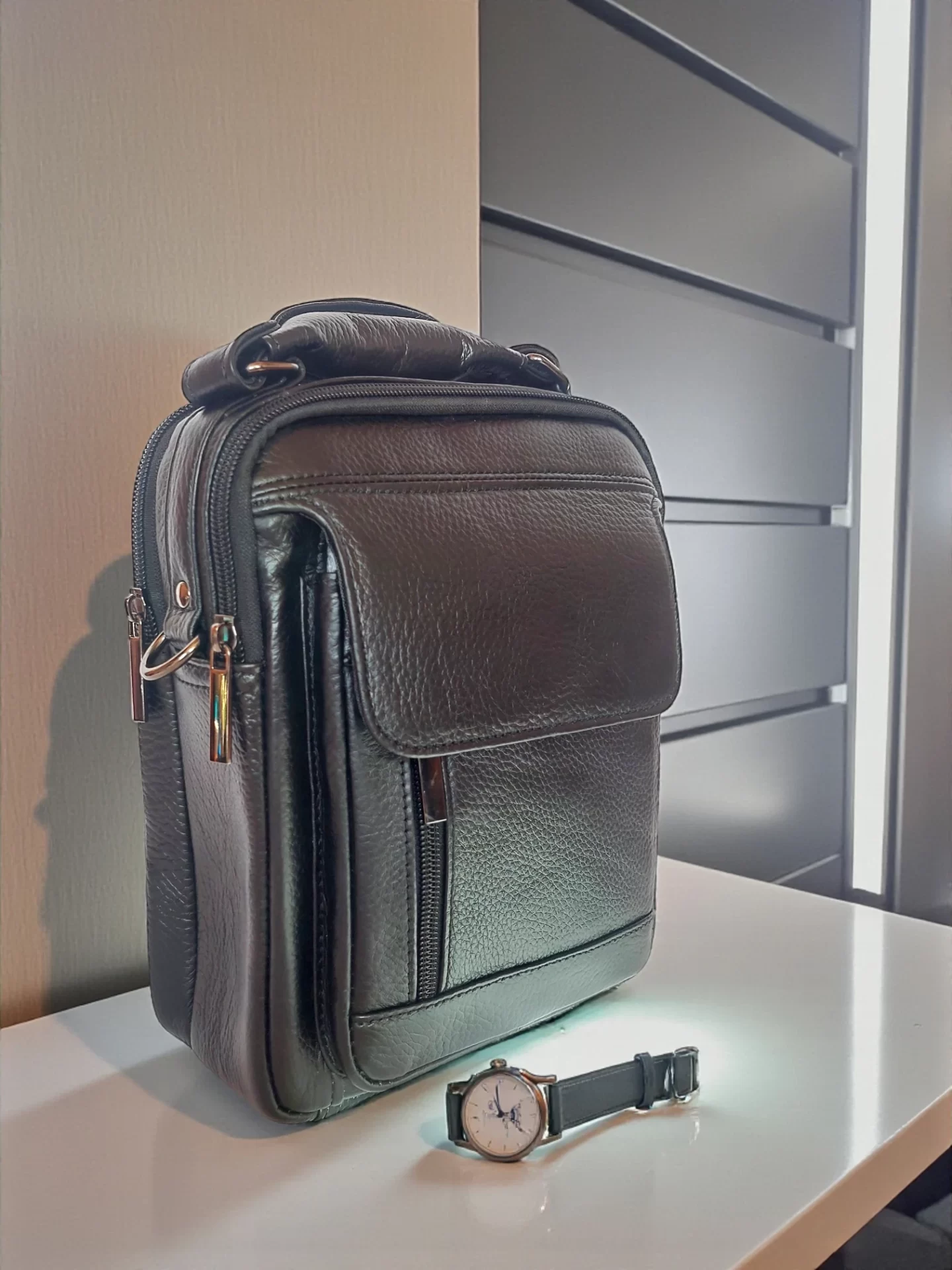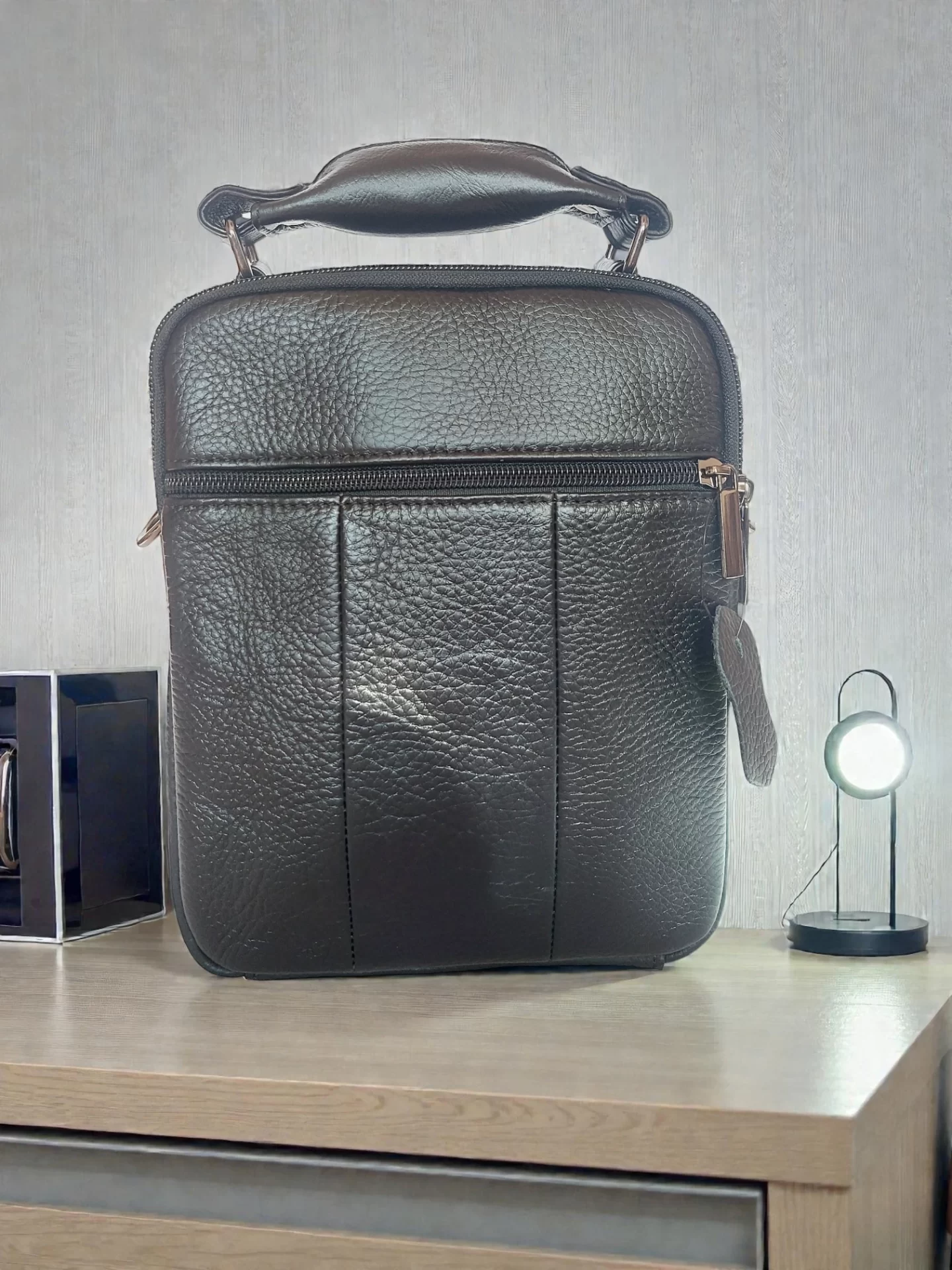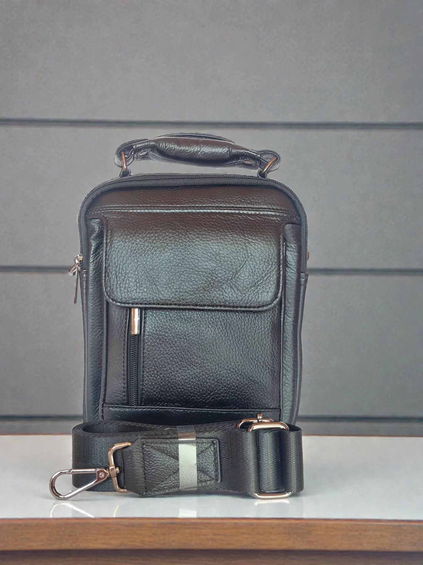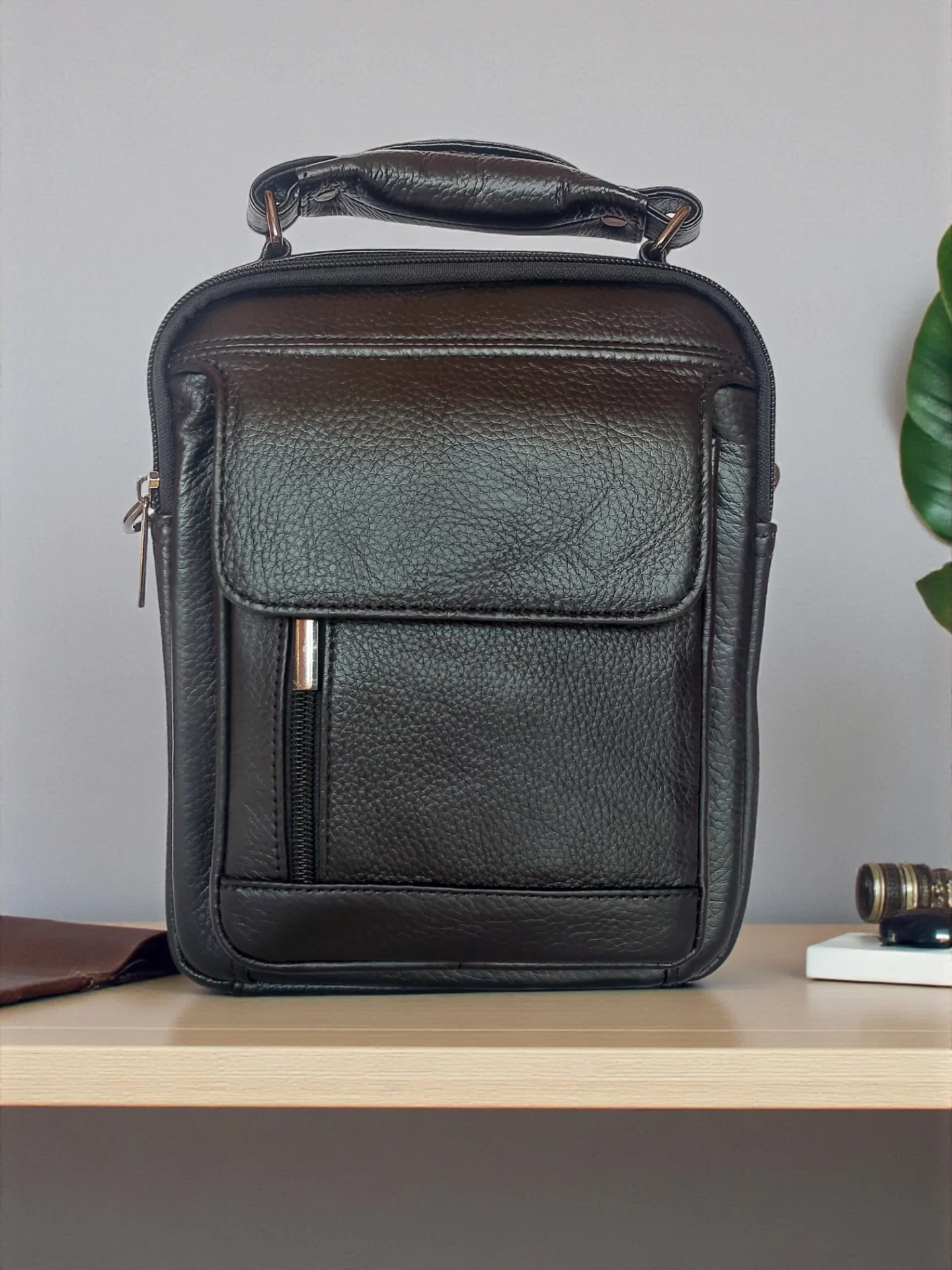 Стилна черна мъжка чанта от 100% естествена кожа — удобна за ежедневие и работа. Носи се както в ръка, така и през рамо благодарение на регулируемата презрамка. Компактният размер побира най-необходимото без излишен обем.