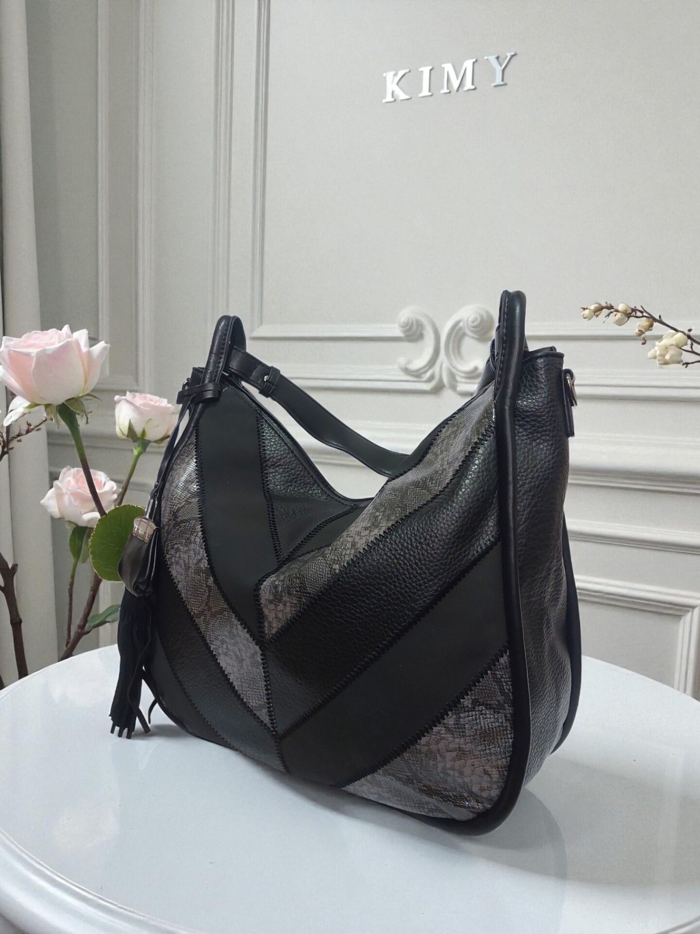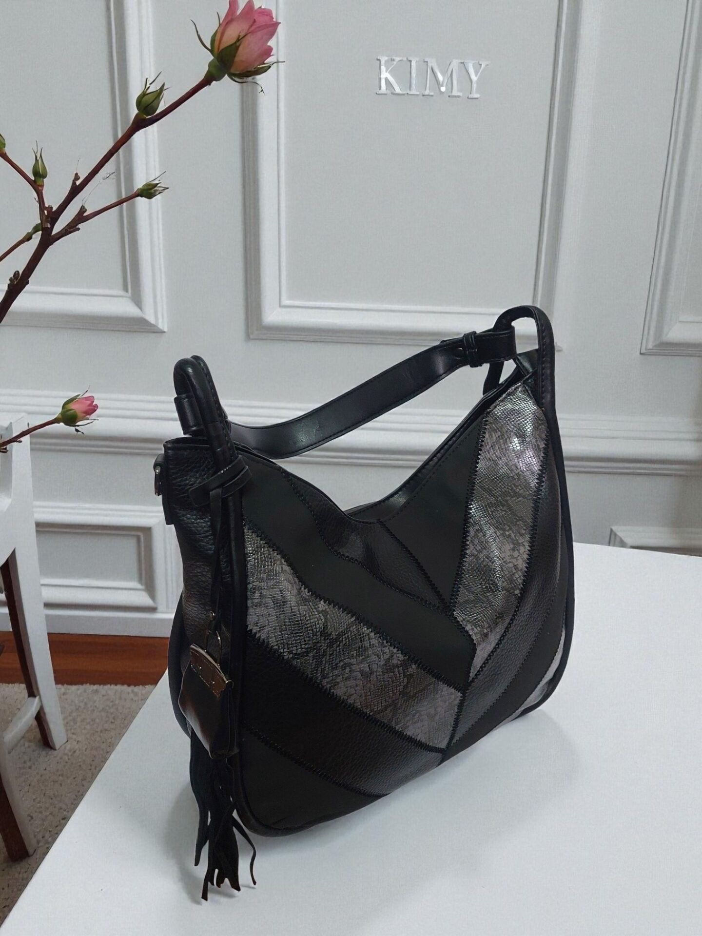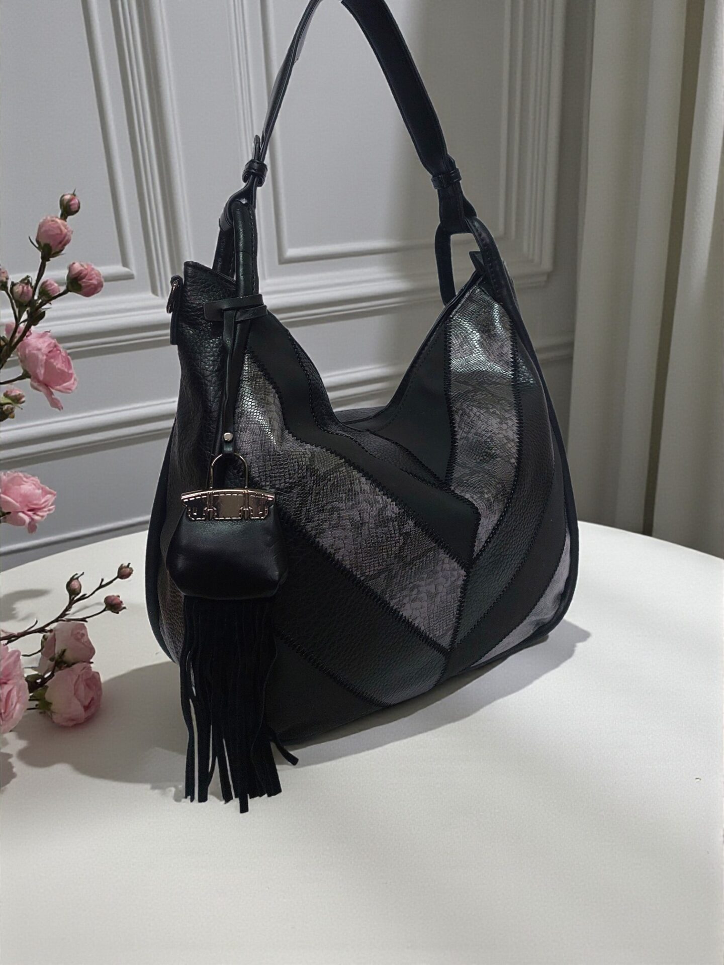 Стилна черна дамска чанта — просторна, удобна и лесна за комбиниране с всяка визия. Подходяща за работа, пазаруване и ежедневие. Побира всички необходими вещи през деня благодарение на големия обем и практичното разпределение.
