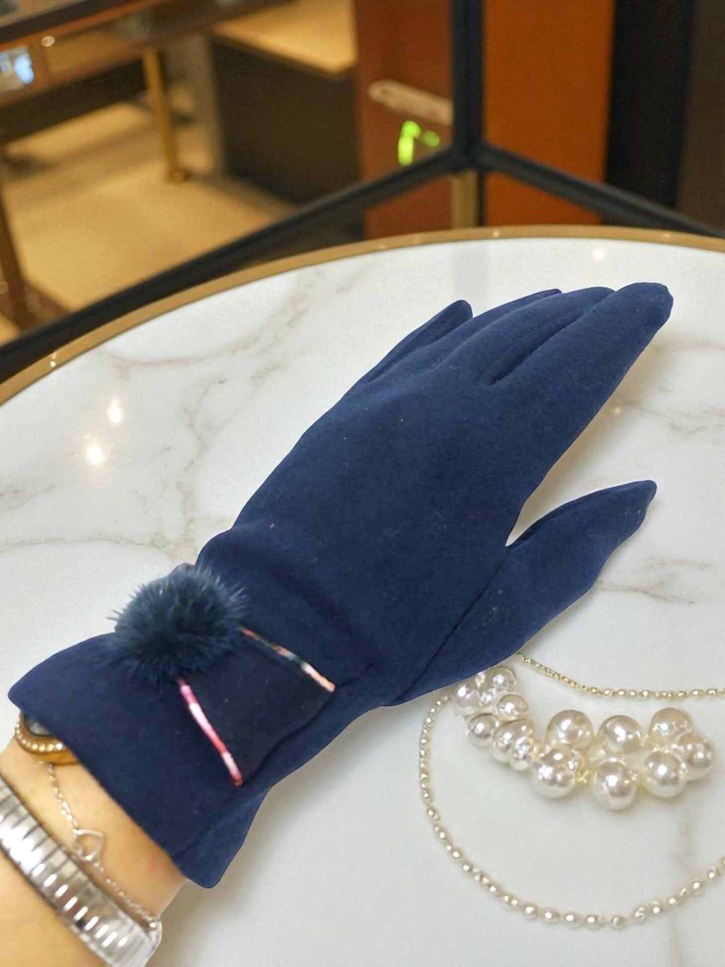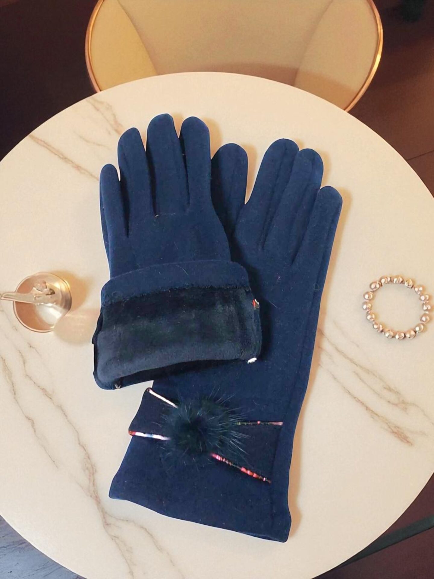 Стилни дамски тъмносини ръкавици с пух – комфорт и изискан вид за зимата.