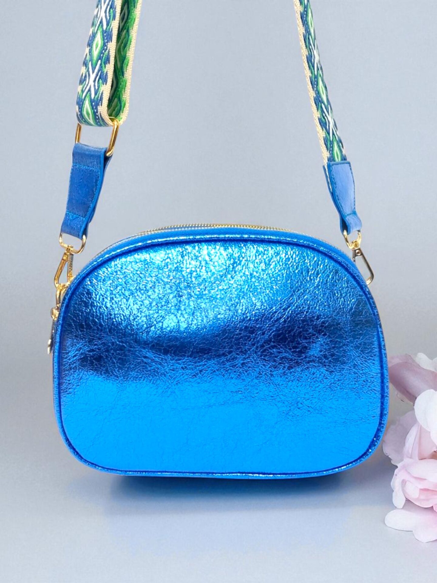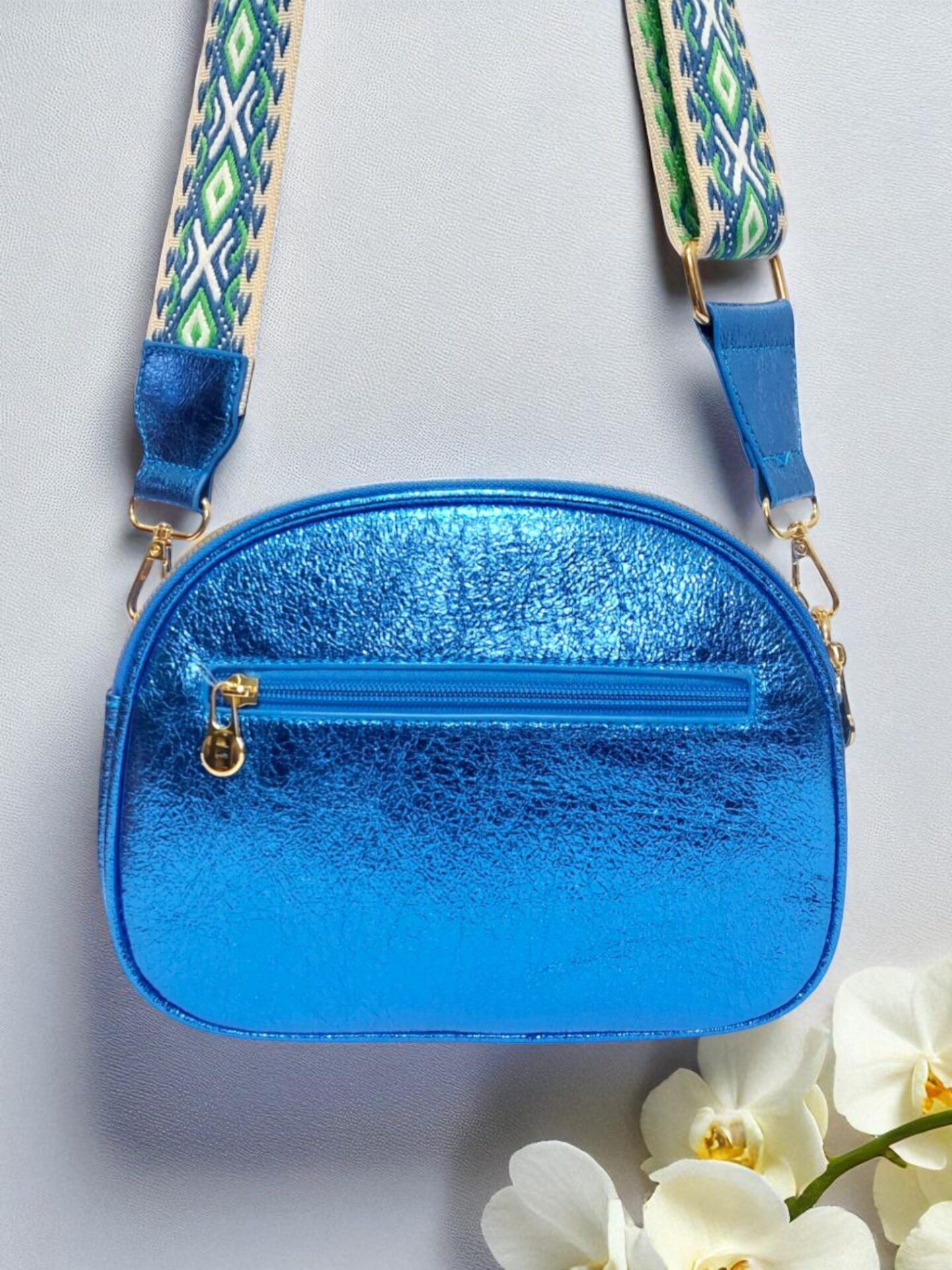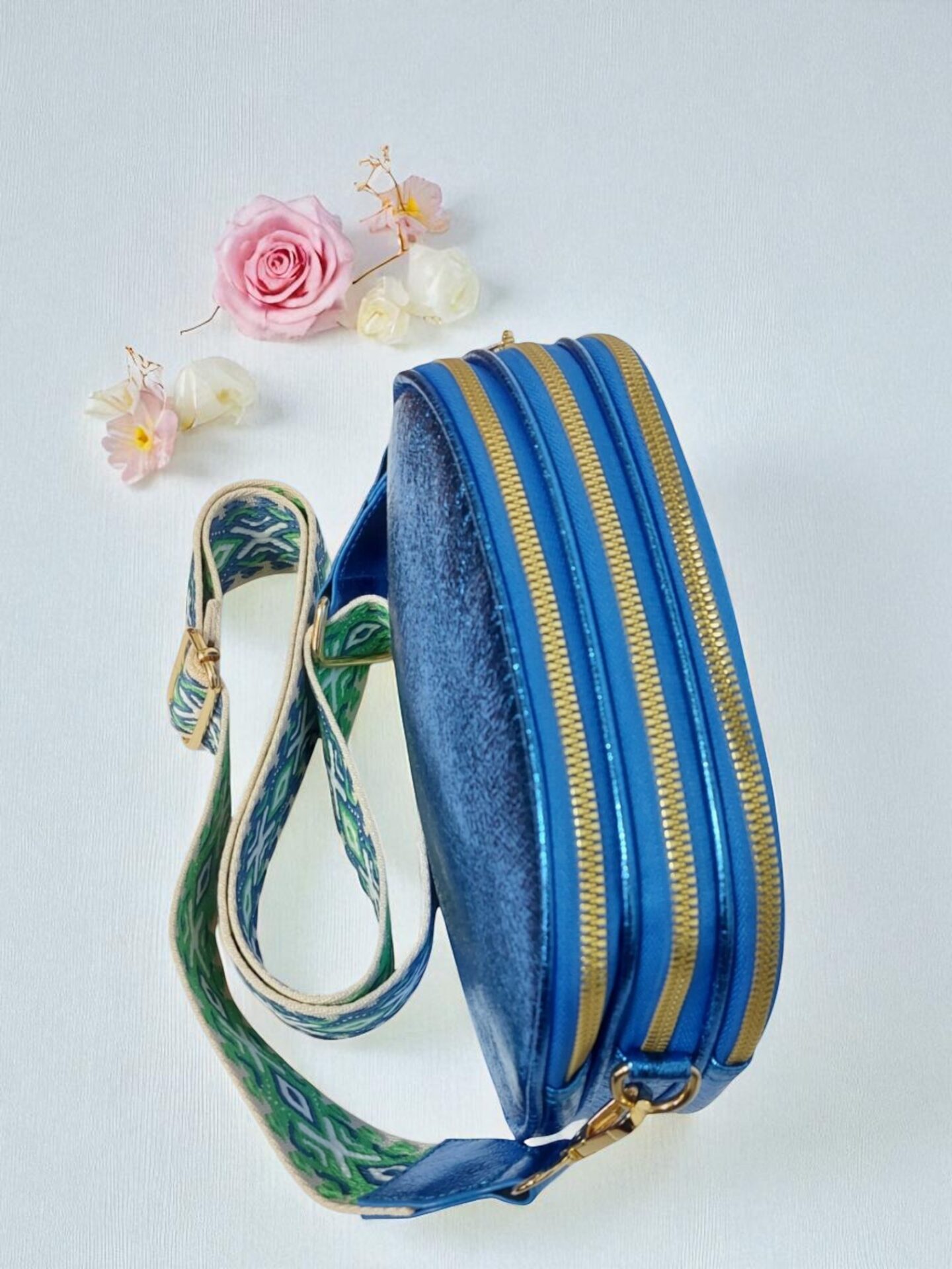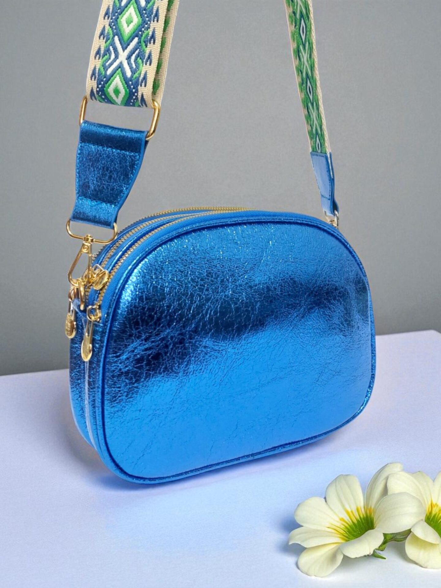 Чантата предлага практично разделение на вещите с три отделения с цип, външен и вътрешен джоб за бърз достъп и допълнителна сигурност. Дългата регулируема платнена презрамка осигурява комфорт при носене.