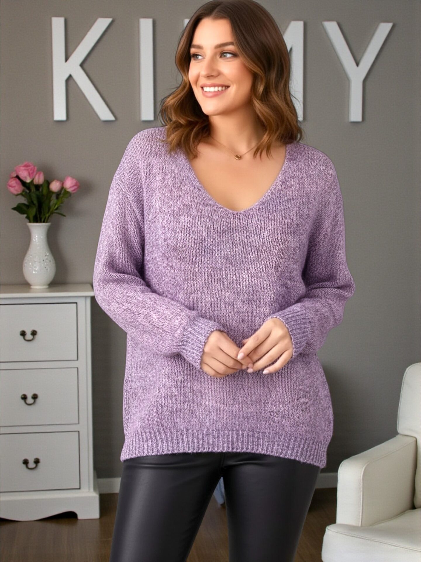 Дамски пуловер, който съчетава стил и комфорт. Моделът е с V образно деколте и е изработен от мека и топла материя в нежни лилави нюанси. Пуловерът е подходящ за ежедневни визии и се съчетава лесно с панталони, дънки или пола.
