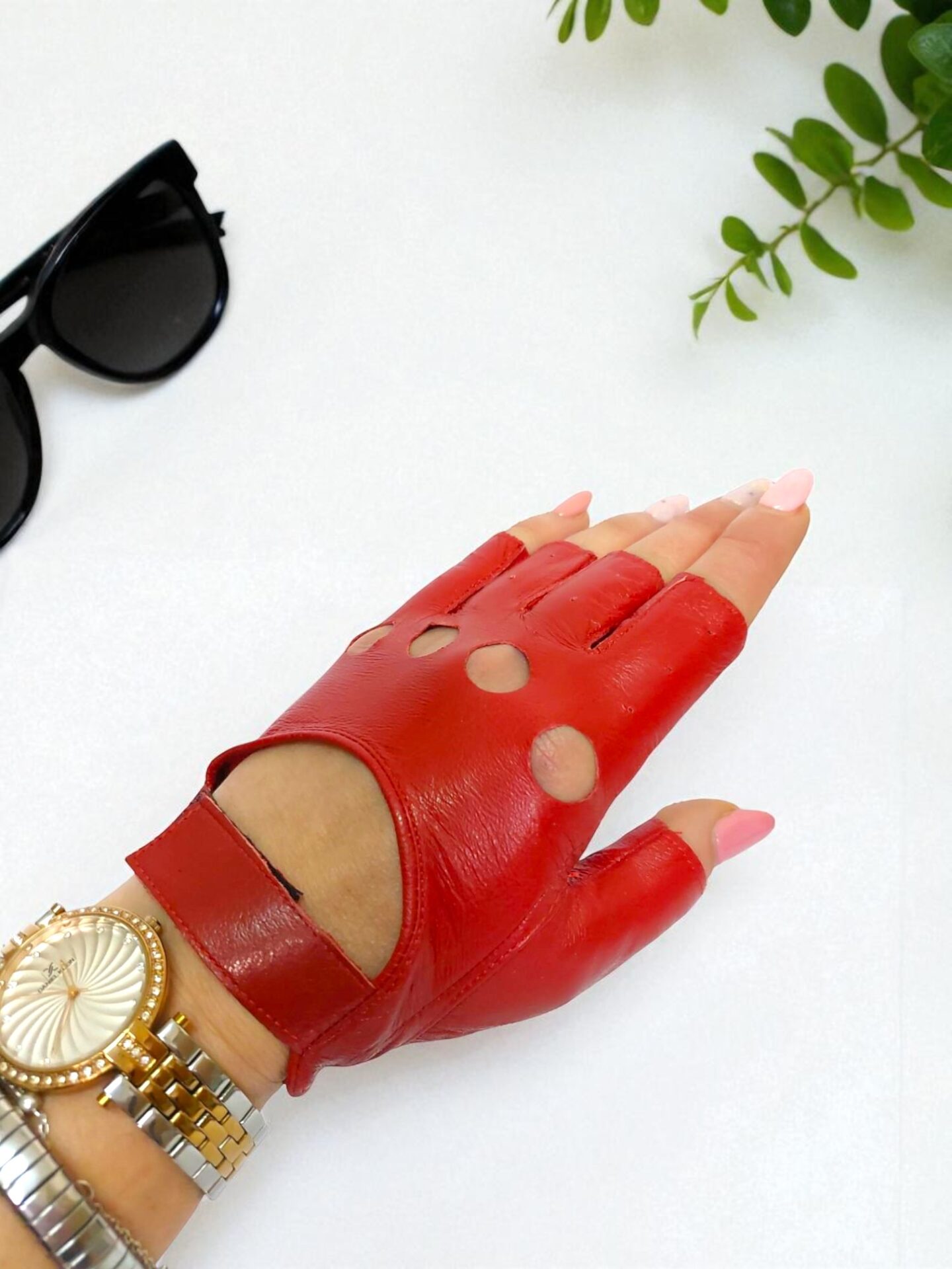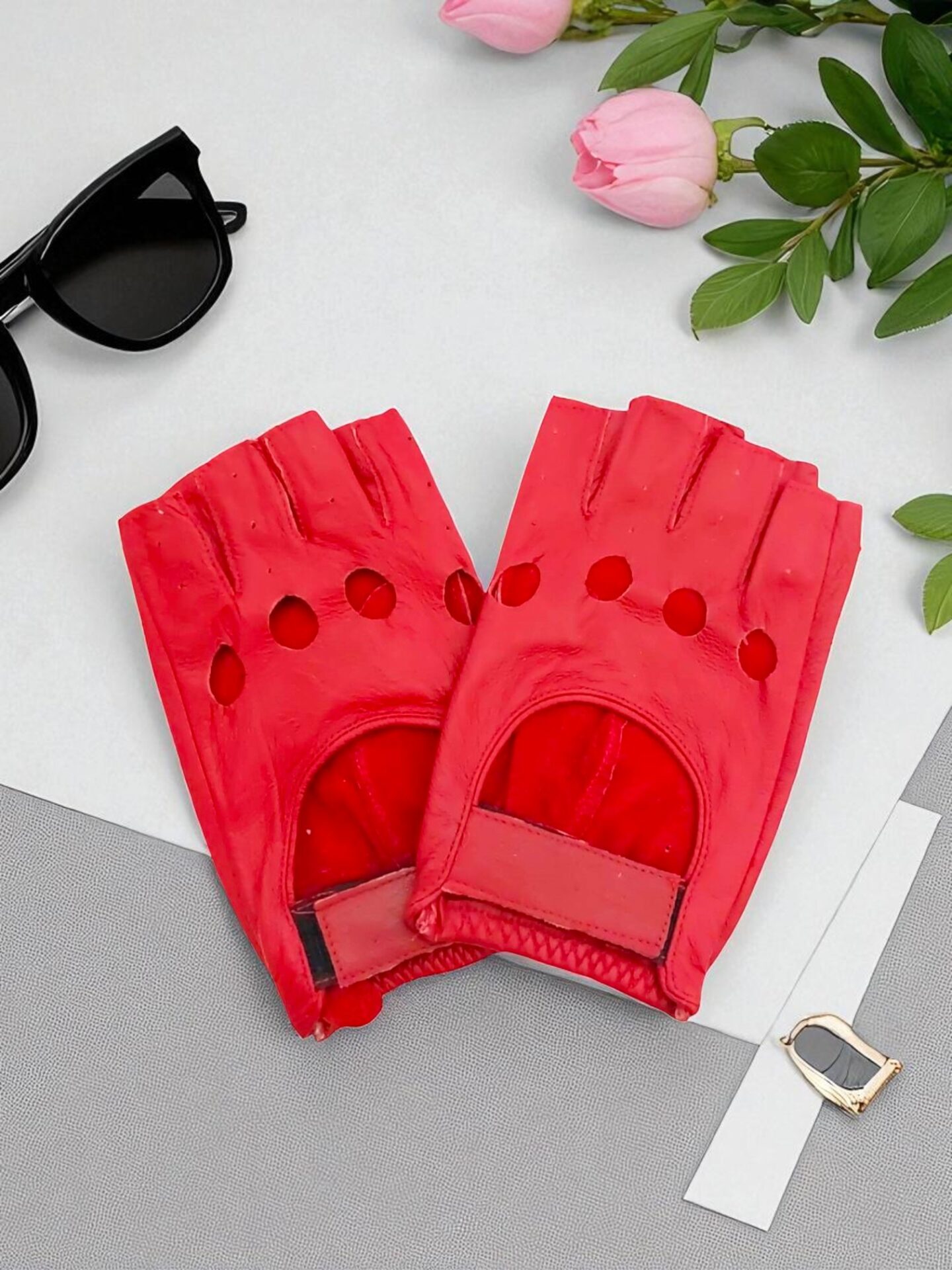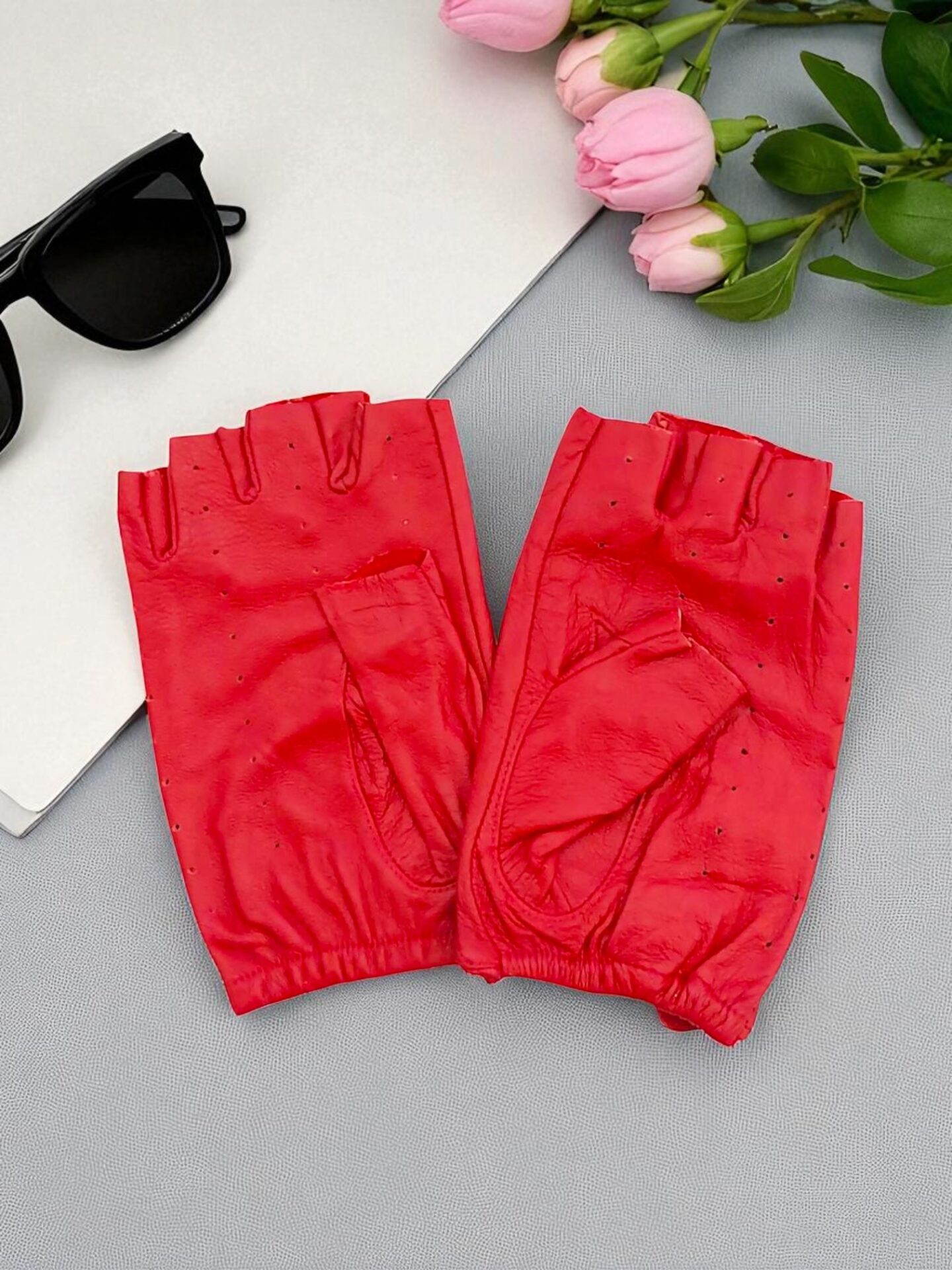 Стилни червени дамски ръкавици без пръсти от естествена кожа – комфортни, практични и с модерен акцент. Перфектни за шофиране, колоездене или като елегантен аксесоар.